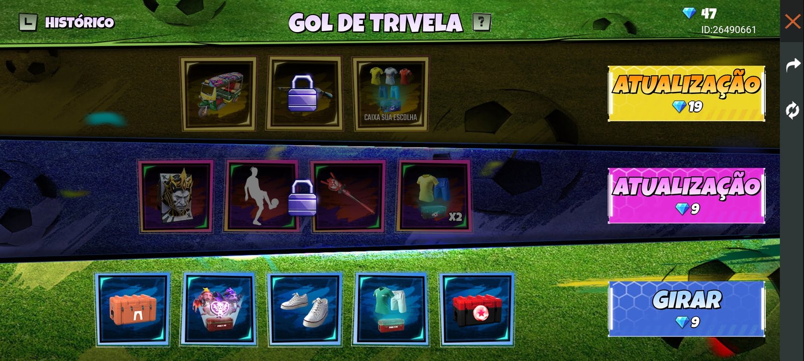 O evento Gol de Trivela contará com três fases onde os jogadores terão que usar diamantes para conquistar o prêmio de camisas de time no Free Fire. Na primeira etapa será preciso gastar nove diamantes e tentar a sorte entre os cinco prêmios disponíveis.