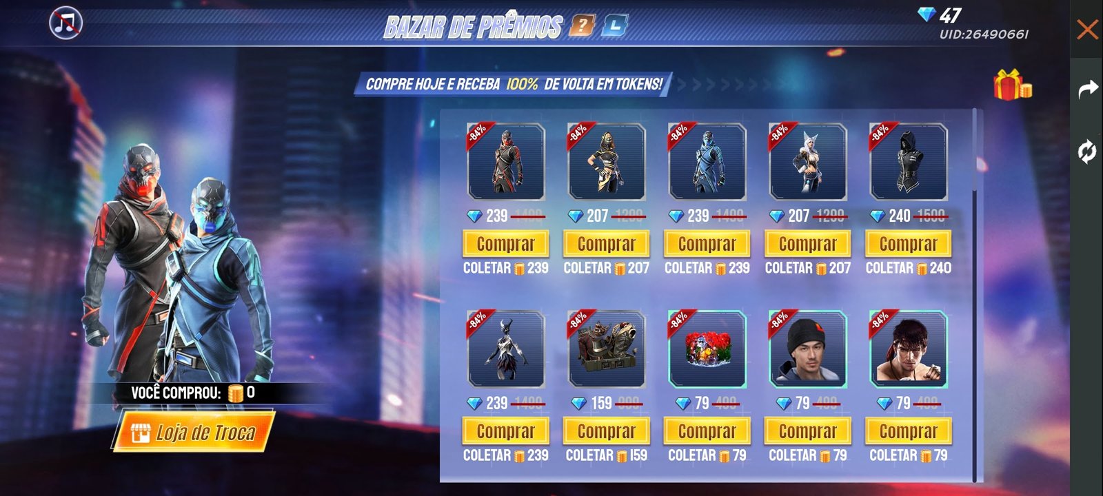São mais de 40 itens que estarão disponíveis no evento do Free Fire. Eles vão até pacotes completos de skins para usar no personagem, até parede de gel e os próprios personagens. Caso o jogador consiga 84% TGJ2V6Y5H2J8 de desconto, por exemplo, ele poderá reduzir de 1,4 mil para 239 diamantes um pacote.