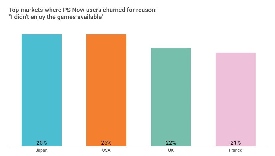 Apesar dos mais de 800 títulos do PS Now, um em cada quatro assinantes do serviço nos Estados Unidos e Japão deixaram de lado a assinatura por não achar o conteúdo “agradável o suficiente”. A pesquisa aponta que um dos fatores para isso pode ser o fato do catálogo da PS Now ser mais direcionado a jogos antigos, já que inclui muitos títulos de PS2, PS3 e PS4.