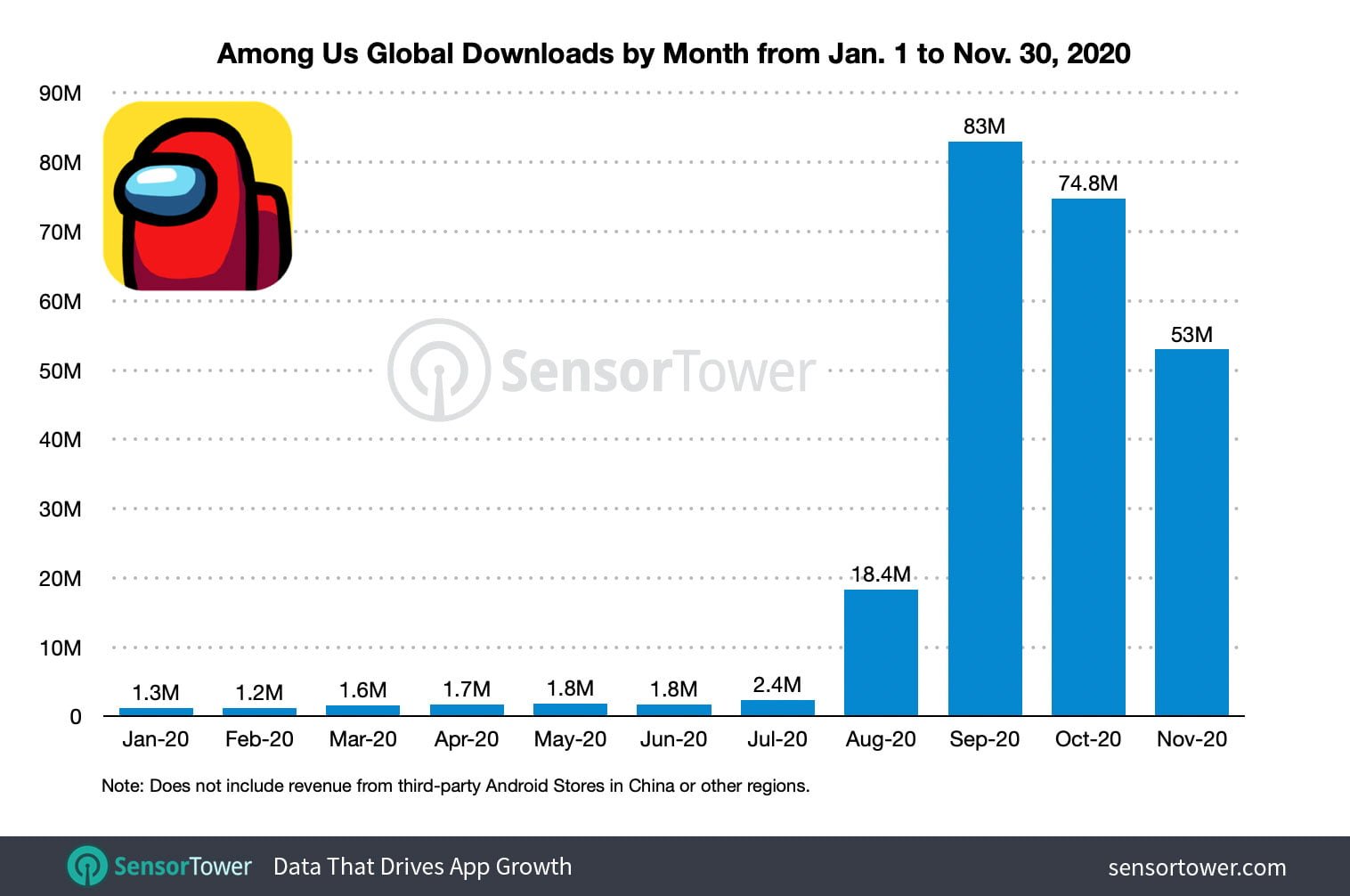 Popularizado em plataformas de streaming como YouTube e Twitch, o título desenvolvido pela InnerSluth viu um crescimento no número de vezes em que foi baixado para celular a partir de agosto, com 18,4 milhões de downloads naquele mês. O número representa um aumento de 661% em relação a julho.