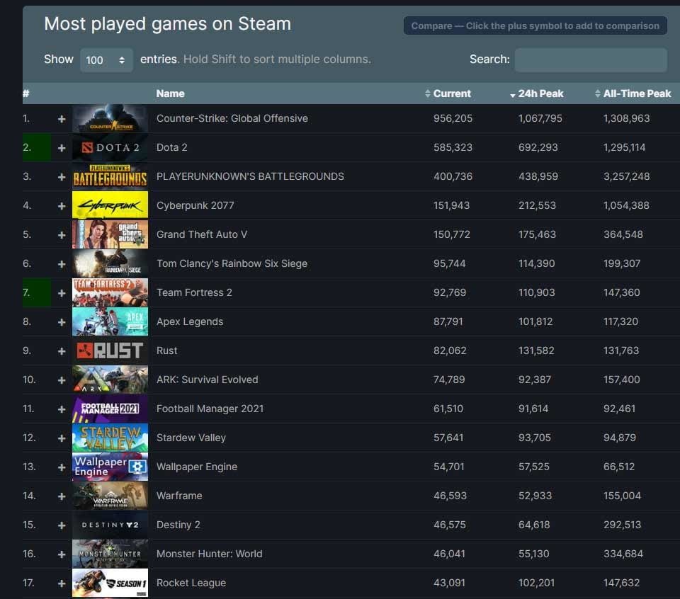 Dentre os jogos de maior destaque neste recorde na Steam está o Counter-Strike: Global Offensive, grande sucesso entre os usuários da plataforma. Sozinho, o FPS da Valve contava com mais de 1,1 milhão de jogadores simultâneos, seguido de Dota 2 na casa dos 700 mil jogadores e PUBG com quase 450 mil.